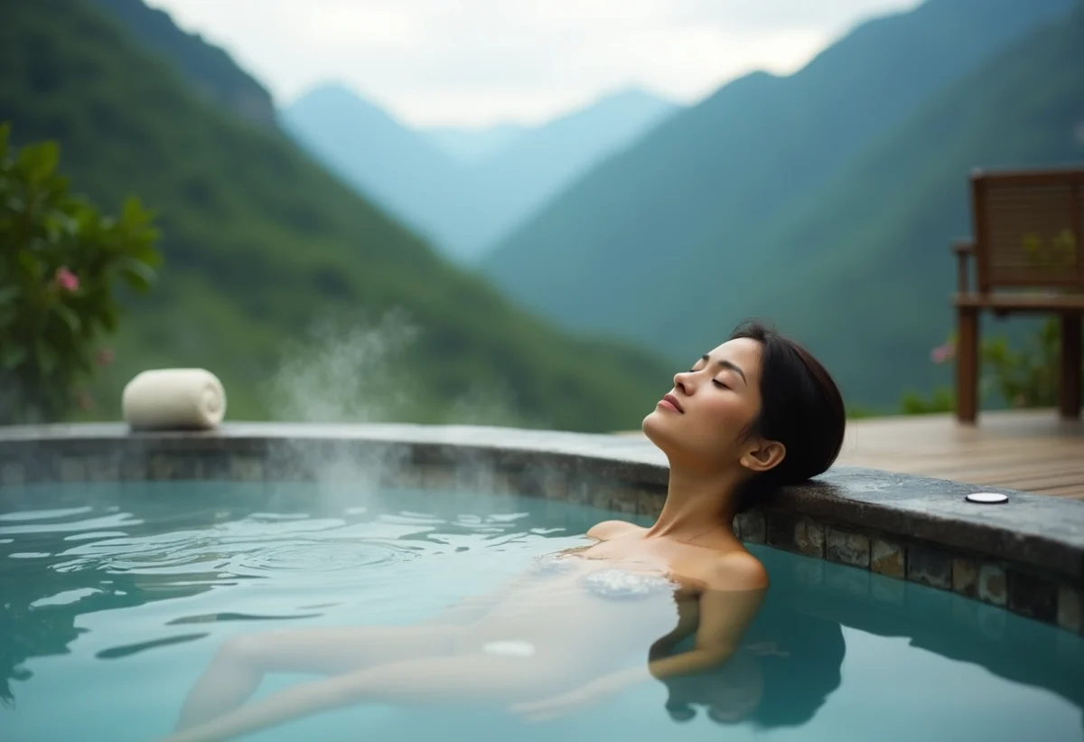 - Un bain nordique extérieur, alimenté par une eau chaude naturelle, face aux montagnes.