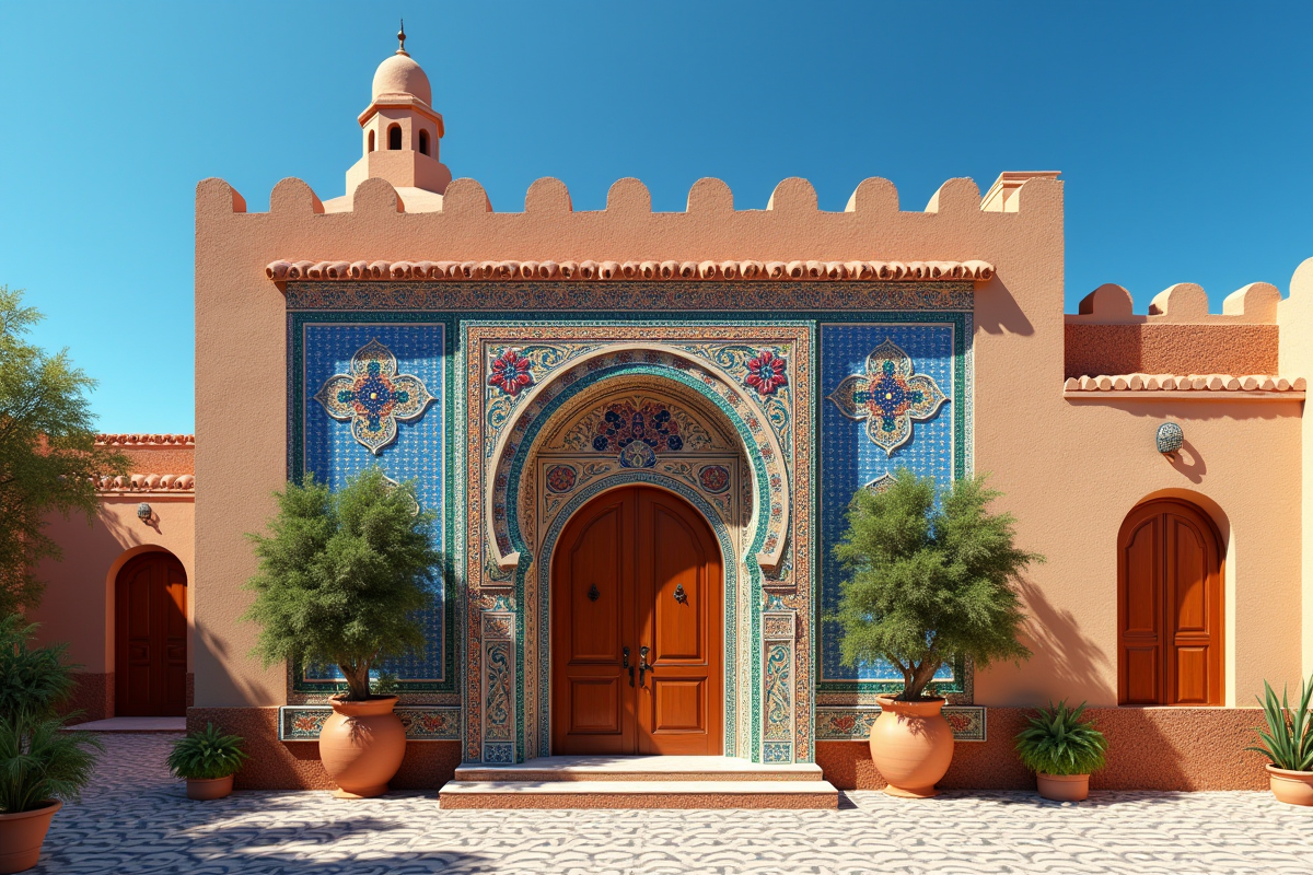 L’architecture marocaine traditionnelle doit beaucoup aux influences culturelles variées qui ont marqué le pays au fil des siècles. Parmi elles, l’art hispano-mauresque se distingue par son raffinement et ses motifs géométriques complexes. Cet art, né de la fusion des cultures arabe et espagnole, se manifeste dans des éléments architecturaux tels que les arcs en fer à cheval, les azulejos et les plafonds en bois sculpté.